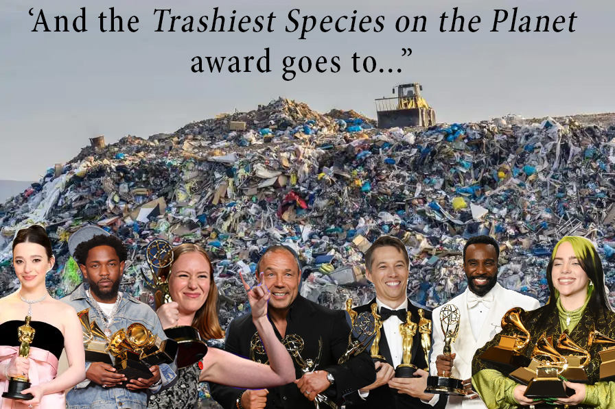 Each award show, such as the Oscar Awards, the Emmy Awards, the Grammy Awards, even other events like the NFL Super Bowl, should begin with the total environmental impact, destruction, and resources their sectors and audience (that’s us) contributed to the planet that year, such as all the food waste (i.e. catering, half-eaten hot dogs, spilled popcorn, etc.), factory farming reliance, fast fashion, water usage, plastics, emissions from travelling to concerts, and so on.