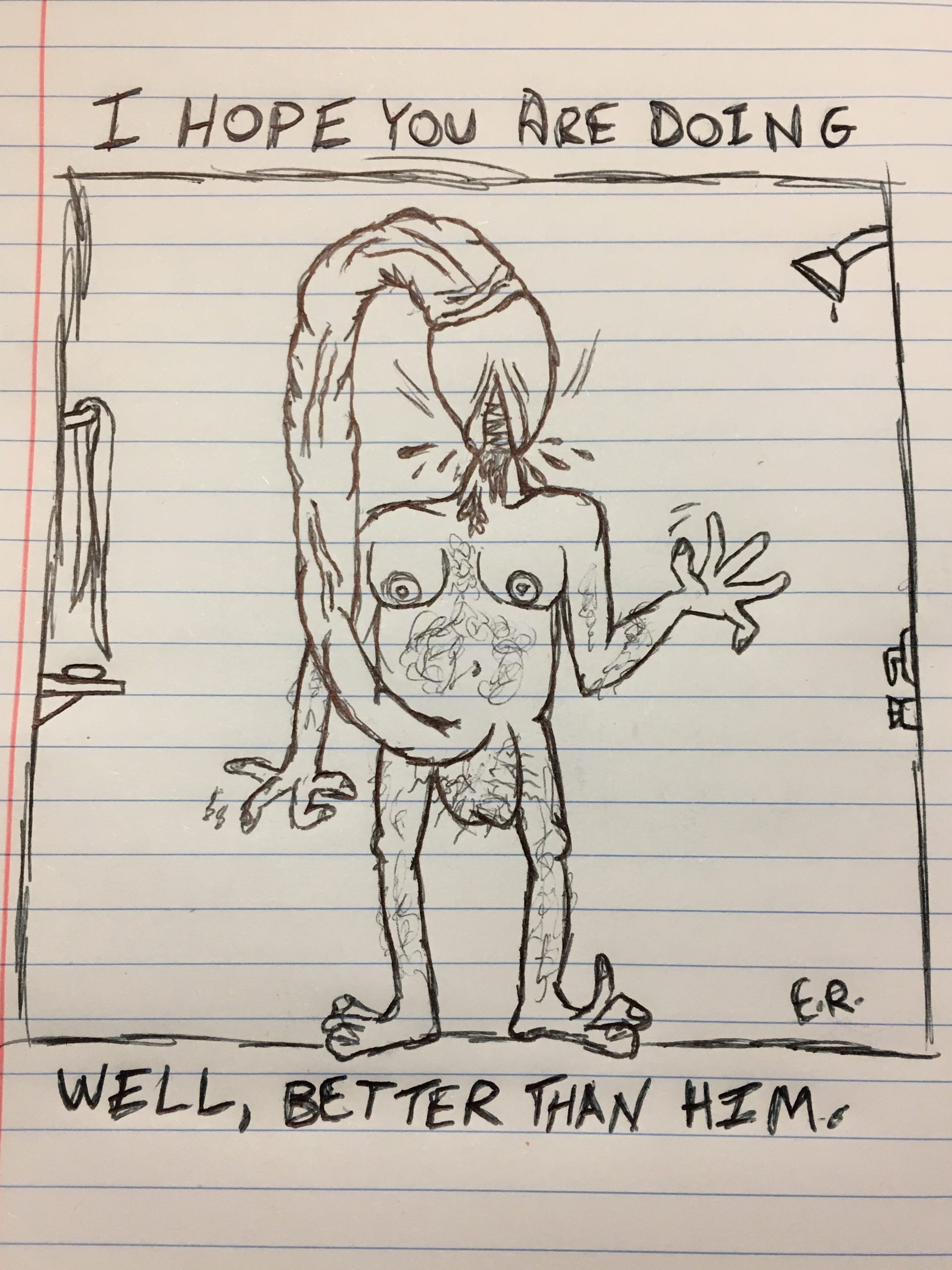 Anyway, this is one of a 2 or so random-as-fuck drawings that I have no idea now (been 9 years) what inspired them. I don’t question anymore for the most part. I no longer ask “why?” I say “why not!” (actually have been saying that since i was a kid).
